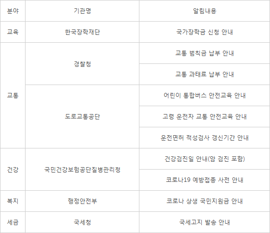 국민비서 알림 서비스는 총 10종이다. 백신접종부터 재난지원금, 교통범칙금, 운전면허 갱신, 국가장학금, 운전면허 적성검사, 어린이 통학버스, 건강검진일까지 자주 사용하는 앱을 통해 알림 서비스를 받을 수 있다. 인공지능(AI) 챗봇 서비스를 통해서는 경찰민원과 사이버범죄 등의 상담도 가능하다.