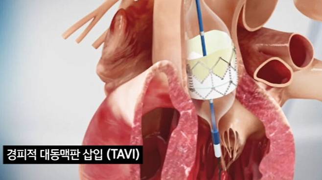 심장 대동맥 판막에 이상이 생겼을 때 가슴을 절개하는 대신 허벅지에 작은 구멍을 낸 뒤 혈관을 통해 인공 판막을 심장까지 밀어 올리는 TAVI 시술.
