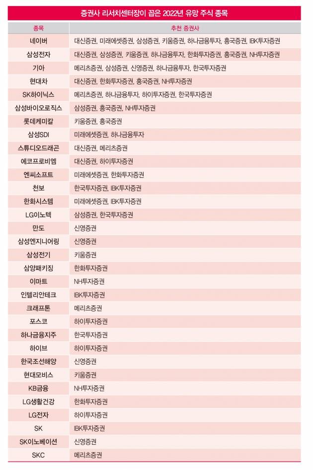 2022년 유망 주식으로는 삼성전자와 네이버가 ‘톱픽스’로 조사됐다. 리서치센터장 13명에게 유망주 각 5개씩을 추천하도록 한 결과 삼성전자와 네이버가 각각 7표씩을 받으며 공동 1위에 올랐다.
