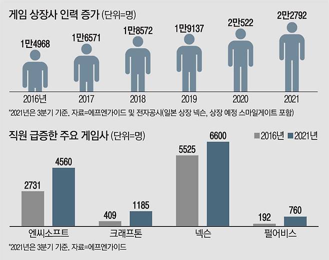 여기에 '돈을 쓰는 게임(P2W·돈을 쓸수록 이기는 구조)'에서 '돈을 버는 게임(P2E)'으로 게임업계 패러다임이 빠르게 전환되면서 주요 게임사들은 웃돈을 얹어 가면서까지 능력 있는 인재 확보에 혈안이 됐다. 대형 게임사들은 지난 5년간 몸집을 2배 가까이 불리며 인재 모으기에 나섰는데 이들의 인재 확보전은 올해를 기점으로 이전과 비교할 수 없을 만큼 가속도가 붙어 국내 소프트웨어(SW) 인재를 빨아들이고 있다는 분석이다.
