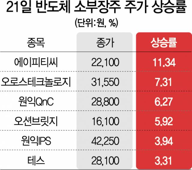 21일 국내 반도체 소부장 업체들의 주가는 일제히 강세를 보였다. 원익IPS(240810)와 원익QnC(074600)가 각각 3.94%, 6.27% 급등했고 테스(095610)도 3.31% 올랐다. 이 밖에 에이피티씨(089970)(11.34%), 오션브릿지(241790)(5.92%), 오로스테크놀로지(322310)(7.31%)가 급등했다.