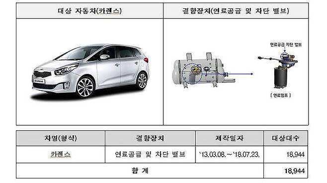기아에서 제작·판매한 카렌스 1만8천944대는 LPG 연료펌프 내부의 연료를 공급·차단하는 밸브 제조 불량으로 인해 주행 중 연료 공급이 차단돼 시동이 꺼질 가능성이 확인됐습니다.
