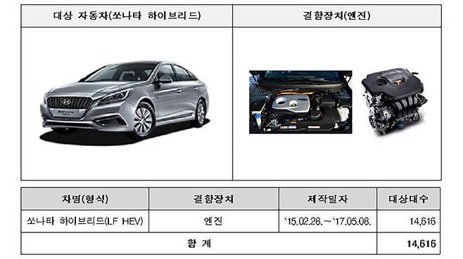 현대차에서 제작·판매한 쏘나타 하이브리드 1만4천616대는 엔진 내부의 일부 부품 마모 등 손상으로 인해 간헐적으로 주행 중 시동이 꺼지거나 화재가 발생할 가능성이 있는 것으로 나타났습니다.