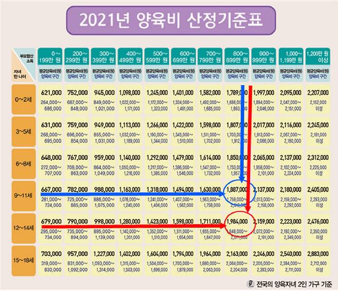 양육비산정 기준표, 4년만에 개정..구간별 10만원 이상 증가