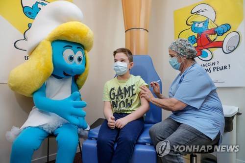 epa09653839 A child is vaccinated accompanied by a giant Smurfette on the launch day of the vaccination for children aged 5 to 11 against COVID-19, in Brussels, Belgium, 22 December 2021. EPA/STEPHANIE LECOCQ