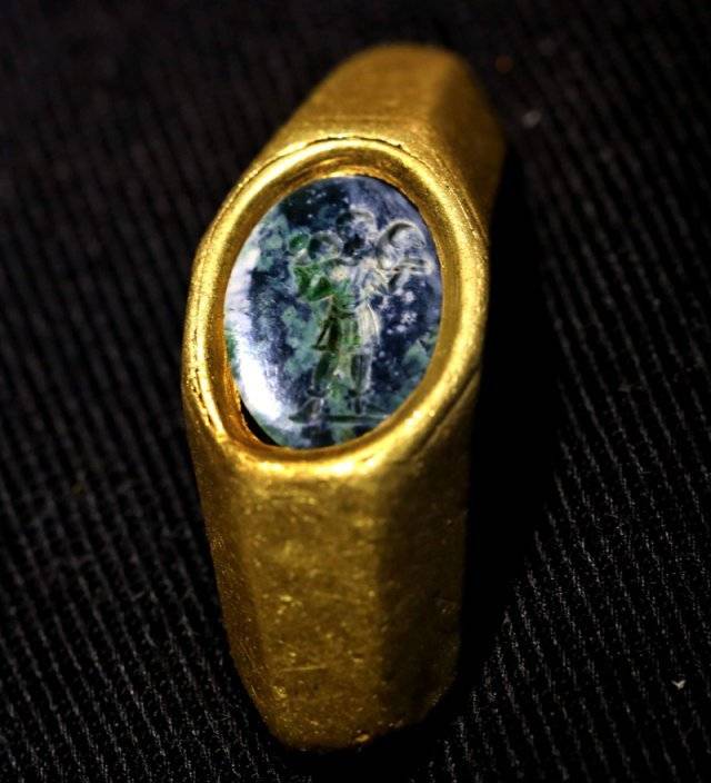 지중해의 고대 난파선에서 발견된 녹색 보석이 세팅된 금반지로 목동이 양을 어깨에 메고 가는 모습이 세공돼 있습니다.