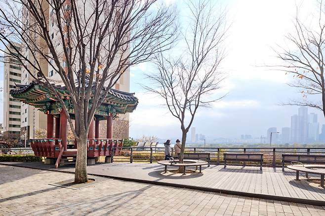 광흥당에서 본 밤섬의 흑백 사진을 시작으로, 밤섬부군당을 거쳐 드디어 밤섬의 현재를 볼 수 있는 곳이다. 강변에 쭉 도열한 아파트 사이, 어떻게 남겨 놓았나 싶은 쌈지 공간이 바로 밤섬공원이다. 공원은 작지만, 밤섬 전체의 탁 트인 풍경과 그 너머 여의도의 스카이라인이 한눈에 들어오는 숨겨진 조망 포인트다. 1968년 폭파된 밤섬은 영화 <김씨표류기>의 촬영지로 유명하지만, 람사르 습지로 등록된 중요한 생태자원이기도 하다. 공원에는 철새 조망을 위한 망원경과 분수대도 있다.