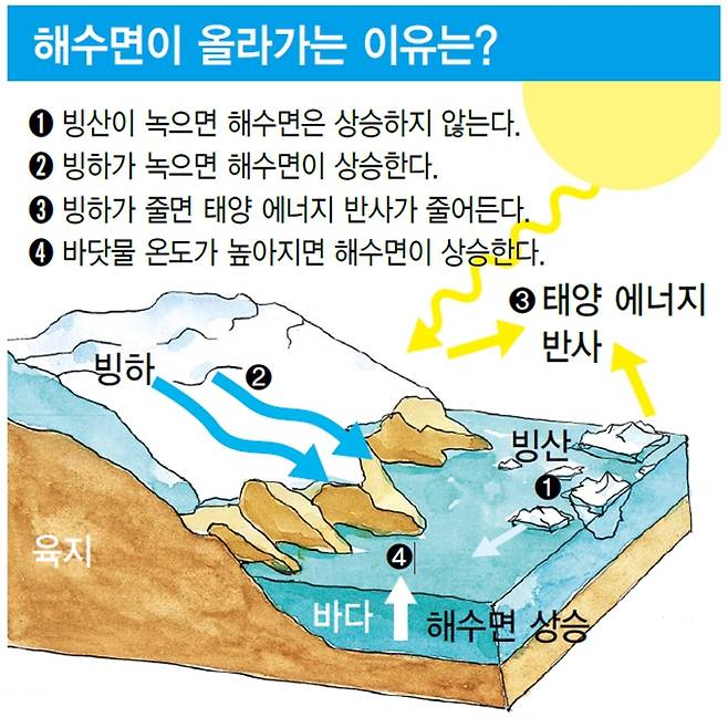 다음 넷 중 ‘참’인 문장은 몇 개일까? 첫째, 빙산이 녹으면 해수면은 상승하지 않는다. 둘째, 빙하가 녹으면 해수면이 상승한다. 셋째, 빙하가 줄면 태양 에너지 반사가 줄어든다. 넷째, 바닷물 온도가 높아지면 해수면이 상승한다. 답은 맨 끝 문장에 있다.