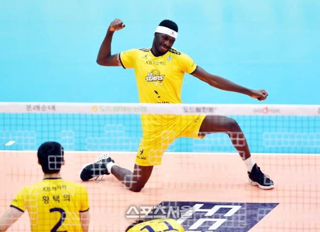 KB 케이타가 23일 의정부체육관에서 열린 2021-22프로배구 KB손해보험과 OK저축은행의 경기에서 서브에이스를 기록한 후 자축하고 있다. 2021.12.23.