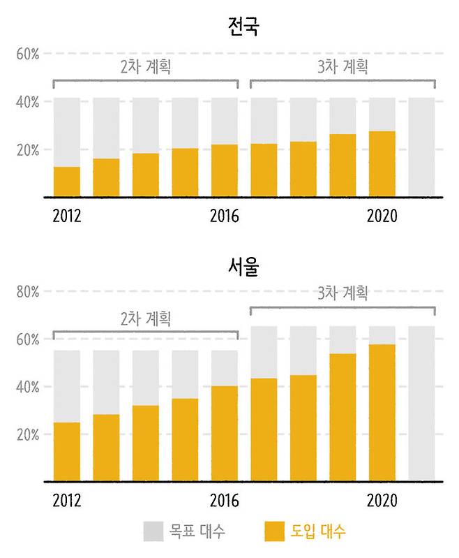 가장 저상버스가 많은 서울조차도 계획에 한참 못 미치고 있어요. 2차 계획에서 서울의 목표치는 절반을 넘는 55%로 세웠지만 달성하지 못했고, 65%를 목표로 했던 3차 계획도 작년 기준으로는 달성하지 못하고 있죠. 2020년 서울의 시내버스 7,392대 중에 저상버스는 4,272대로 57.8%를 기록했거든요. 그래도 서울은 2019년부터 저상버스의 비율이 50%를 넘고 있어요.