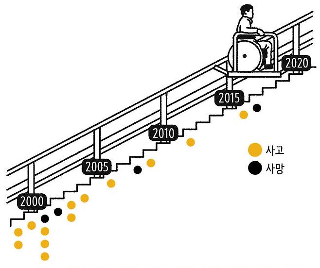 2004년까지 엘리베이터 설치 약속은 17년이 지난 아직까지도 지켜지지 않고 있어요. 정권이 바뀌어도 큰 변화는 없었죠. 2015년에도 고 박원순 시장이 2022년까지 모든 공사를 완료하겠다고 약속했지만 그 약속도 지켜지지 않고 있어요. 그 사이 2017년에는 신길역에서 또다시 휠체어 리프트에서 장애인이 떨어져 사망하는 사고가 발생했죠. 1999년부터 2020년까지 서울 지하철에서 발생한 리프트 사고는 모두 17건, 그중 사망사고는 4건이나 됩니다.