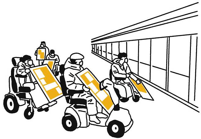 2001년, 오이도역에서 장애인 한 분이 목숨을 잃는 사고가 발생합니다. 장애인용 리프트가 추락하는 사고였죠. 이 사건 이후로 장애인들의 이동권을 보장해달라는 투쟁이 본격적으로 시작됐어요. 2002년, 이번엔 발산역에서 장애인 한 분이 돌아가셨어요. 역시나 장애인용 리프트가 추락하는 사고였죠. 목소리를 높여도 바뀌지 않자 장애인들은 39일간의 단식투쟁을 했습니다. 결국 당시 이명박 서울시장은 2004년까지 서울 지하철 전 역사에 엘리베이터를 설치하겠다는 약속을 해요. 장애인의 목숨으로 지하철에 변화가 생긴 겁니다.