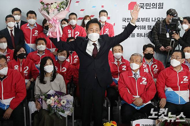 국민의힘 오세훈 서울시장 후보가 4월 8일 새벽 서울 여의도 국민의힘 중앙당사에 마련된 개표상황실에서 당선이 확실해지자 두손을 들어 환호하고 있다. 오 후보는 57.5%를 득표하며 서울 전역 25개구에서 모두 승리한 것으로 나타났다. 윤창원 기자