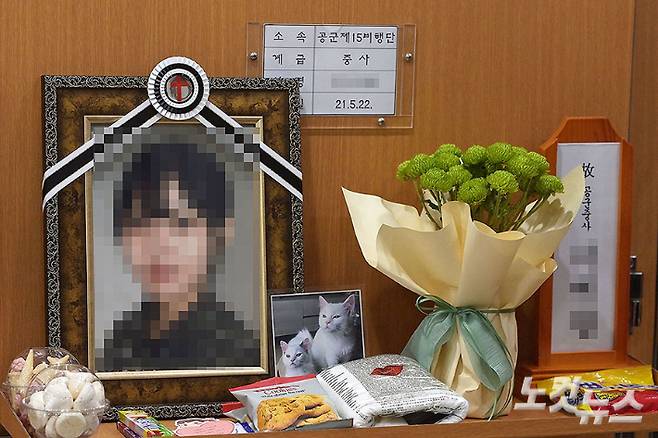 6월 2일 오후 경기도 성남시 국군수도병원 장례식장 영안실에 안치된 A중사의 주검 앞에 영정사진이 놓여 있다. 지난 3월 초 선임 장모 중사로부터 강제로 추행을 당한 A중사는 이튿날 피해 사실을 정식으로 신고하고 전출시켜 달라는 요청을 했다. 그는 경기도 성남의 15전투비행단에서 근무하던 중 지난달 22일 부대 관사에서 숨진 채 발견됐다. 이한형 기자