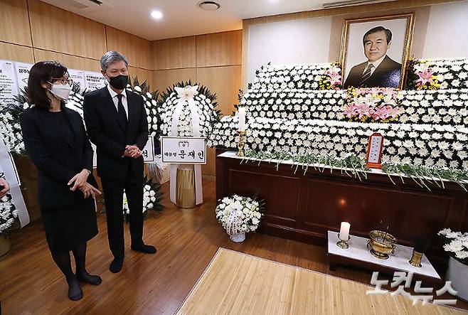 10월 27일 노태우 전 대통령 빈소가 마련된 서울대병원 장례식장에서 딸 노소영 아트센터 나비 관장(왼쪽)과 아들 노재헌 동아시아문화센터 이사장이 조문객을 맞이하고 있다. 정부는 노 전 대통령의 장례를 국가장으로 치르기로 결정, 30일까지 5일장으로 치러진다. 사진공동취재단
