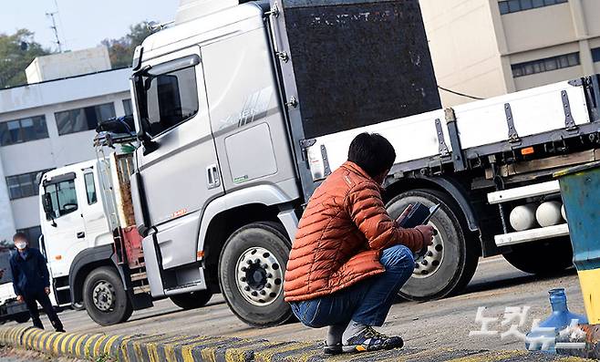 경유 차량 운행에 반드시 필요한 '요소수' 의 품귀 현상이 갈수록 심해지는 가운데 11월 4일 서울 양천구 서부트럭터미널에서 요소수 부족으로 운행을 나기지 못한 대형 트럭 운전사들이 한숨을 쉬고 있다. 황진환 기자