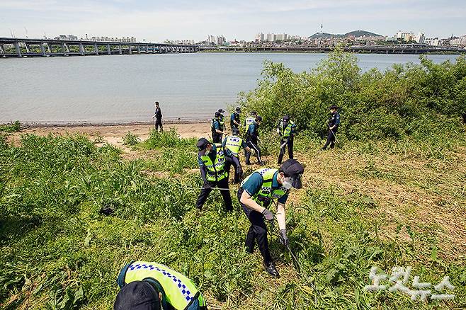 서울 한강공원에서 술을 마신 뒤 실종됐다가 숨진 채 발견된 대학생 손정민(22)씨의 사인이 부검 결과 익사인 것으로 확인됐다. 5월 13일 서울경찰청 관계자는 브리핑에서 "손씨의 사인은 익사로 추정되며 머리 2개소 좌열창은 사인으로 고려할 정도로 보기 어렵다는 의견을 (국립과학수사연구원으로부터) 받았다"고 밝혔다. 사진은 지난 12일 서울 서초구 반포한강공원 수상택시 승강장 인근에서 고 손정민씨 친구의 휴대전화 수색 작업을 하고 있는 경찰의 모습. 박종민 기자