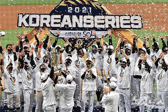 11월 18일 서울 고척스카이돔에서 열린 신한은행 쏠 KBO리드 2021 한국시리즈 4차전에서 두산을 꺾고 우승을 차지한 kt 선수들이 환호하고 있다. 시리즈 전적 4승 무패를 거둔 kt는 2013년 창단 이후 8년, 2015년 1군 무대 진입 후 7시즌 만에 최초로 정규리그·한국시리즈 통합 우승을 달성했다. 박종민 기자