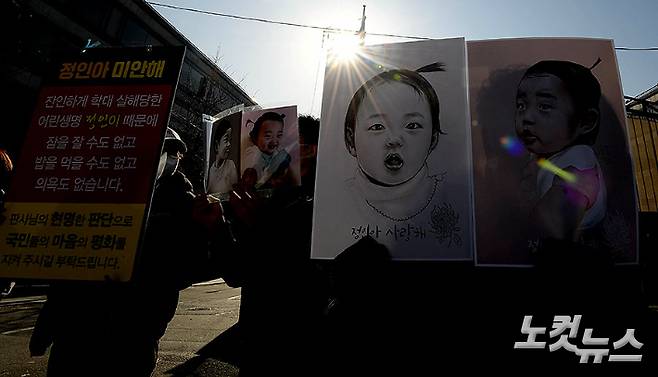 생후 16개월 된 정인양을 학대해 숨지게 한 혐의를 받는 양부모의 2심 선고를 앞둔 11월 26일 오전 서울 서초구 서울고법 앞에서 시민들이 손팻말을 들고 있다. 정인양을 학대해 숨지게 한 양모는 2심에서 형을 감경받았다. 서울고법 형사7부(성수제 부장판사)는 살인 등 혐의로 기소된 정인양 양모 장모씨에게 무기징역을 내린 1심 판결을 뒤집고, 26일 징역 35년을 선고했다. 아동학대 등 혐의로 재판에 넘겨진 양부 안모씨에게는 1심과 마찬가지로 징역 5년을 선고했다. 이한형 기자