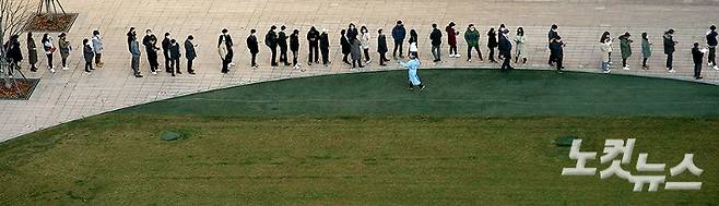 코로나19 신규 확진자 수가 7천175명으로 역대 최다치를 경신한 12월 8일 서울광장 임시선별검사소를 찾은 시민들이 검사를 받기 위해 줄을 서 있다. 신규 확진자가 7천 명을 돌파한 것은 지난해 1월 20일 국내 첫 확진자가 나온 이후 688일 만이다. 박종민 기자