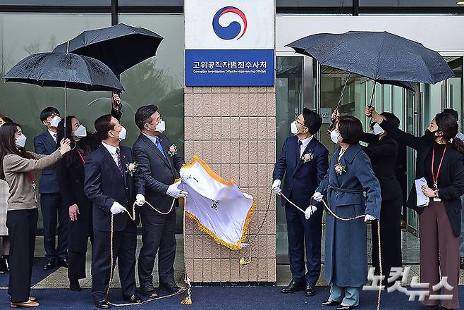 1월 21일 오후 정부과천청사에서 열린 고위공직자범죄수사처 현판식에서 김진욱 초대 처장, 추미애 법무부 장관, 윤호중 국회 법사위원장 등이 제막하고 있다. 박종민 기자