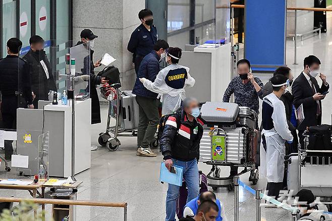 코로나19 변이 바이러스 오미크론 유입 차단을 위해 남아공 등 8개국 발 외국인 입국이 제한된 11월 29일 오전 인천국제공항 제1터미널에서 해외 입국자들이 입국 절차를 밟고 있다. 방역당국은 2일 오미크론 감염자가 국내에서 6명까지 확인됐다고 밝혔다. 한편 앞으로 2주 동안 모든 입국자를 대상으로 백신 접종 여부와 관계없이 10일 동안 격리 조치를 시행하기로 했다. 박종민 기자