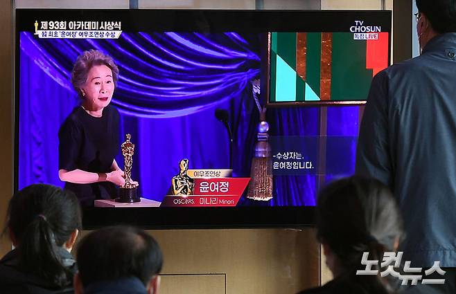 제93회 아카데미 시상식이 열린 4월 26일 오전 서울역 맞이방에서 시민들이 영화 '미나리' 출연배우 윤여정의 여우조연상 수상 모습을 시청하고 있다. 황진환 기자
