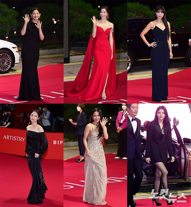 배우 박소담(윗줄 왼쪽부터 시계방향으로), 김규리, 오윤아, 한소희, 고민시, 전여빈이 10월 6일 오후 부산 해운대구 영화의 전당에서 열린 '제26회 부산국제영화제(BIFF)' 개막식에 참석해 레드카펫을 밟고 있다. 황진환 기자