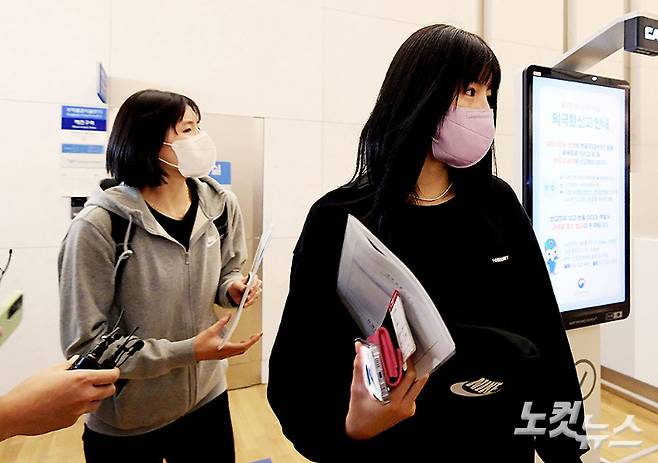 '학교폭력·비밀결혼' 등 각종 의혹과 논란에 휩싸인 배구선수 이재영·이다영 쌍둥이 자매가 10월 16일 오후 인천국제공항을 통해 그리스 테살로니키로 출국하고 있다. 이재영, 이다영은 그리스 테살로니키 PAOK와 계약해 그리스 여자프로배구 A1 리그에서 뛸 예정이다. 이한형 기자