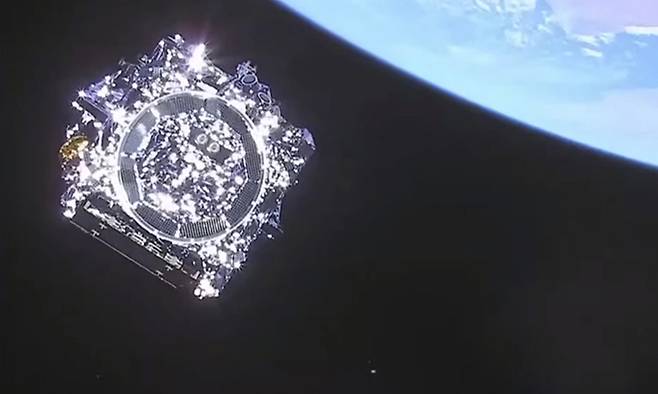 | 로켓과 성공적 분리 제임스웹우주망원경(JWST)이 25일(현지시간) 남미의 프랑스령 기아나 유럽우주국(ESA) 기지에서 아리안 5호 로켓에 실려 발사된 뒤 대기권 밖에서 로켓과 성공적으로 분리된 모습. AP연합뉴스 |