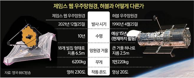 JWST는 1996년 시작된 프로젝트다. 1990년 발사돼 임무를 수행 중인 허블 망원경보다 성능이 개선된 우주망원경을 만들기 위해 나사(미국항공우주국)와 ESA, 캐나다우주국(CSA)이 개발에 참여했다. 1960년대 나사 국장으로서 달착륙 계획을 추진한 제임스 웹의 이름을 땄다.