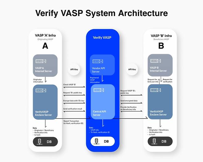 예를 들어 A거래소에서 베리파이바스프(센트럴, Centre)를 통해 B거래소에 코인 발송 정보를 보내는 경우 △A는 센트럴을 통해 수신자 검색 △B가 수신자 정보 확인 및 응답 △A가 센트럴에 암호화 된 '퍼블릭키' 생성요청 △센트럴은 B에 퍼블릭키 생성 및 데이터 요청 △B는 퍼블릭키로 암호화된 데이터 확인 △A도 마찬가지로 코인 발송 및 수신기록 암호화된 데이터 복호화 등의 절차를 거친다.