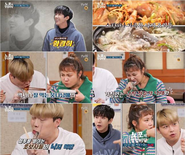 12월 27일 방송되는 tvN '노포의 영업비밀'(연출 손창우)에서는 MC 박나래와 노포 먹방 전문 유튜버인 웅이, 그리고 이들의 밥친구로 나선 광희가 공덕동의 낙지 전문점을 찾는다. 보통 녹화 초반에 급격한 체력소모로 '방송계의 종이인형'이라 불리는 광희는 스태미나에 좋은 산낙지 요리를 먹고 녹화 내내 엄청난 텐션을 유지했다는 후문.
