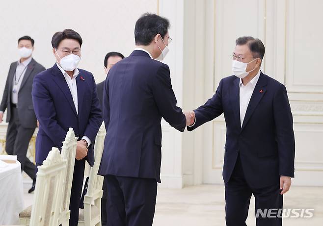 [서울=뉴시스] 김진아 기자 = 문재인 대통령이 27일 청와대에서 열린 '청년희망 온(ON) 참여기업 대표 초청 오찬 간담회'에 참석, 이재용 삼성전자 부회장과 인사하고 있다. 2021.12.27. bluesoda@newsis.com