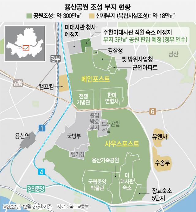 주한 미군 이전 이후 서울 용산기지를 중심으로 조성될 용산공원의 부지가 57만 ㎡ 늘어난 300만 ㎡로 확정됐다. 옛 방위사업청 부지와 군인아파트 부지, 국립중앙박물관 및 전쟁기념관 등이 공원 부지에 신규 편입되면서 당초 계획보다 공원 면적이 넓어졌다. 다만 개장 시기는 당초 계획됐던 오는 2027년에서 ‘미군 기지 완전 반환 7년 후’로 사실상 무기한 연기됐다.