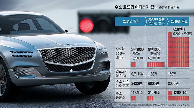 현대차를 중심으로 한 정부의 수소경제 로드맵의 현실성에 대한 의문도 동시에 제기된다. 2019년 발표한 정부의 ‘수소경제 활성화 로드맵’에 따르면 2022년까지 수소차는 누적 8만1000대 판매가 목표다. 하지만 수소차 내수와 수출 실적은 11월 현재 2만1000대에 불과하다. 내년 한 해 동안 약 6만대, 지난 4년여간 누적 판매량의 약 3배가 팔려야만 목표 달성이 가능하다.