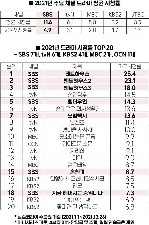 2021년 채널 평균 시청률, 2049 평균 시청률 2년 연속 1위. 시청률 조사 기관 닐슨코리아가 분석한 2021년 주요 채널 드라마(4부작 이하 단막극 및 주말, 일일 연속극은 제외 이하 동일)의 수도권 가구 평균 시청률 결과에 따르면 SBS가 11.6%로 압도적 1위를 차지했다. 그 뒤로 tvN이 6.1%로 2위, MBC가 5.8%로 3위를 기록했고, KBS2가 5.2%, JTBC가 3.5%로 뒤를 이었다. 이는 2020년 SBS가 기록했던 10.6%를 상회하는 수치로 2년 연속 드라마 채널 1위의 위상을 공고히한 결과다. 광고 관계자들의 핵심 지표이자 화제성과 채널 경쟁력을 담보하는 2049 평균 시청률도 4.9%를 기록, 1위를 차지했다.