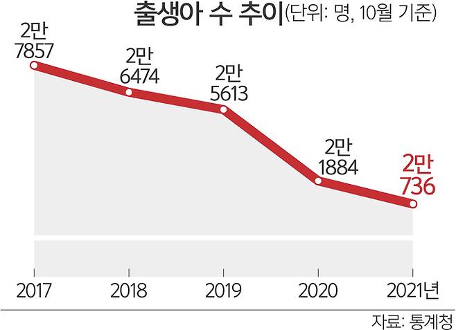 29일 통계청이 발표한 '10월 인구동향'을 보면 지난 10월 출생아 수는 2만736명으로 1년 전보다 5.2% 감소했다.
