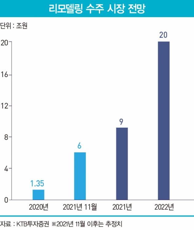 2021년 1~11월 리모델링 수주 시장 규모는 6조3887억원이다. 연말까지 최대 9조원으로 늘어날 것으로 건설업계는 보고 있다. 2020년 전체 리모델링 시장 규모가 1조3500억원에 머물렀던 것과 비교하면 2021년에는 전년 대비 6배가 넘는 성장세를 기록한 것이다.