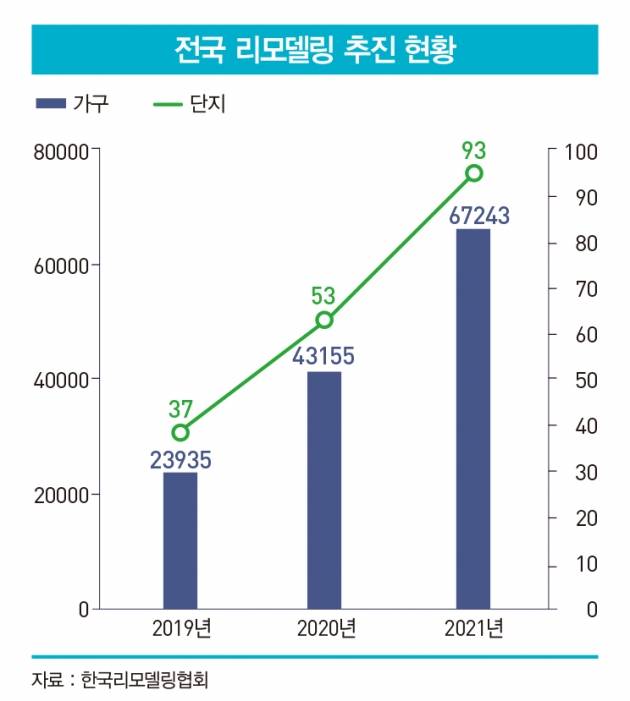 또 재건축에 필요한 사업시행·관리처분계획인가 단계가 생략되는 점도 특징이다. 이러한 특성에 힘입어 서울과 경기도 등 수도권 외 지역에서도 활발한 리모델링 움직임이 나타나고 있다. 이에 따라 2022년 리모델링 시장 규모는 15조~20조원으로 커질 것으로 관측된다.