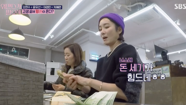 오연수는 “막판, 마지막 힘내자”며 다 팔아보자고 했다. 완판을 위한 사투였다. 아니나 다를까 5만원 짜리 지폐를 싹쓸이한 모습. 급기야 “돈을 세기가 힘들다”며 계산, 홍진경은 “돈 좀 만져본 손이다”고 말해 폭소하게 했다. 이 가운데 오연수는 홀로 총 5백 91만원 어치를 벌었다. 나머지 멤버들 수익까지 더해 총 수익금은 미혼모 협회 기부됐다는 소식을 전했다.