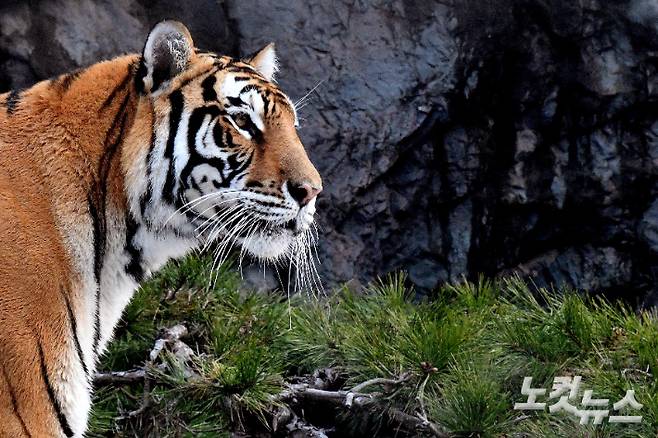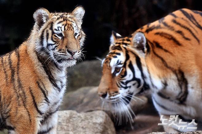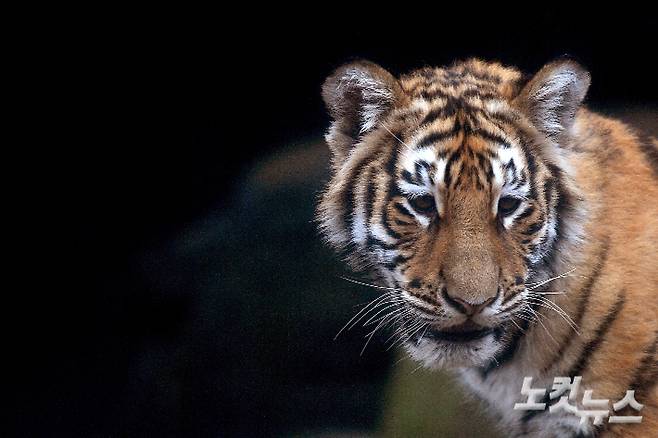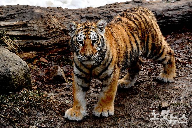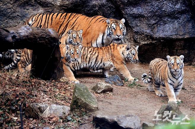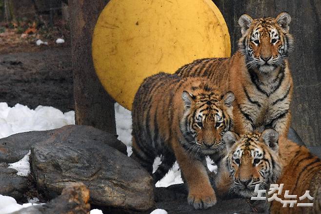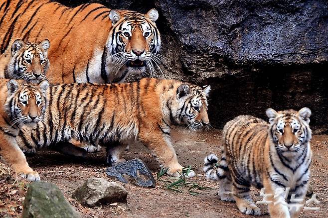 임인년(壬寅年) 호랑이해를 맞아 경기 용인시의 눈덮힌 에버랜드 타이거밸리에서 생활하는 아기 호랑이들 오둥이 아름(♀)·다운(♂)·우리(♀)·나라(♂)·강산(♀)의 모습이 공개됐다. 엄마 호랑이 건곤이와 아기호랑이들이 산책을 하고 있다.