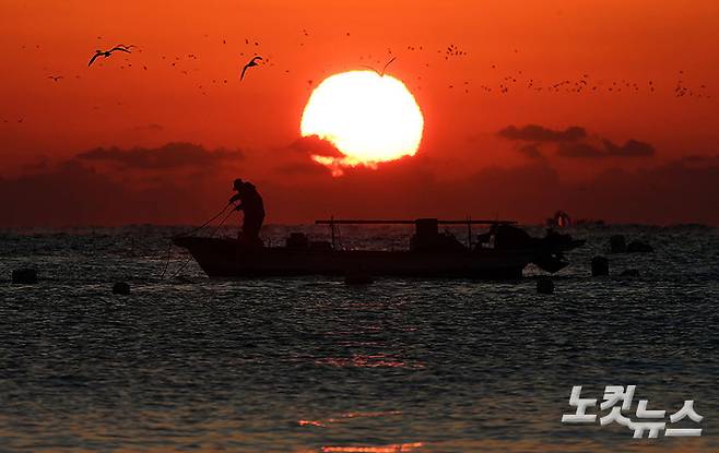 뜨거운 해가 떠오르고 있는 이른 새벽 경남 울주군 강양항 앞바다에서 멸치잡이 어부가 그물을 걷어 올리고 있다. 만선을 알리는 듯한 갈매기떼는 어부의 한 해 피로를 잊게 해 주는 듯하다. 사라지지 않은 코로나19 여파로 힘든 국민들이 임인년 '검은 호랑이의 해' 인 2022년에는 호랑이 기운을 얻어 일상으로 돌아갈 수 있기를 기원한다. 황진환 기자
