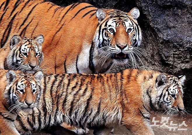 임인년(壬寅年) 호랑이 해를 맞아 눈덮힌 에버랜드 타이거밸리에서 생활하는 아기 호랑이들이 엄마 호랑이 건곤이와 산책을 하고 있다. 박종민 기자