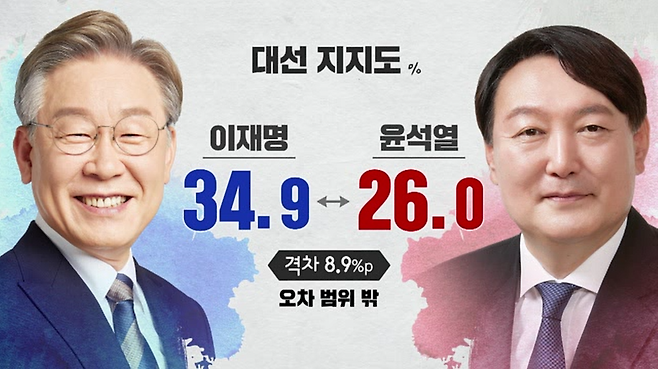 대선 후보 지지도 경우, 민주당 이재명 34.9%, 국민의힘 윤석열 후보 26.0%, 격차는 8.9%포인트로, 이 후보가 오차 범위를 벗어나 앞서는 걸로 조사됐습니다.
