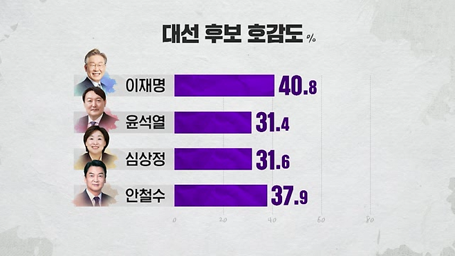 주요 대선 후보들에 대한 호감도는, 이재명 40.8%, 윤석열 31.4%, 심상정 31.6%, 안철수 37.9%였습니다.