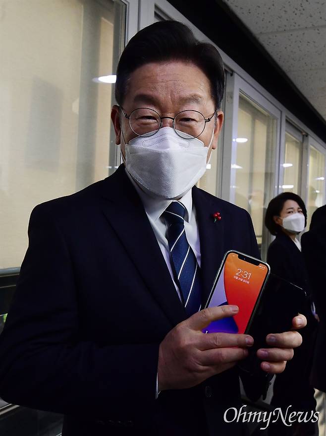 | ▲ 더불어민주당 이재명 대선 후보가 31일 오후 서울 여의도 더불어민주당 중앙당사에서 소확행 국민공모 캠페인 기자회견을 마치고 전달받은 국민제안 시스템 '이재명 플러스' 전용 스마트폰을 들고 있다. |