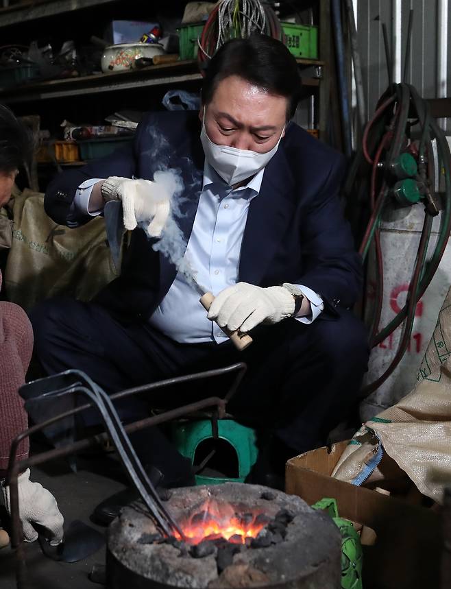 | ▲ 국민의힘 윤석열 대선 후보가 지난 12월 30일 경북 영주시 영주대장간을 방문, 아마존에서 판매 열풍을 일으킨 '호미 장인' 석노기 씨의 설명을 들으며 제작 체험을 하고 있다. |