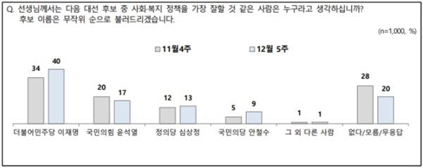 | ▲ NBS 12월 5주 사회복지 정책 적임 후보 11월 4주 대비 12월 5주에 이재명 후보는 사회복지 정책을 잘할 것이라는 평가를 더 많이 받았지만, 윤석열 후보가 잘할 것이라는 응답은 줄었다. |