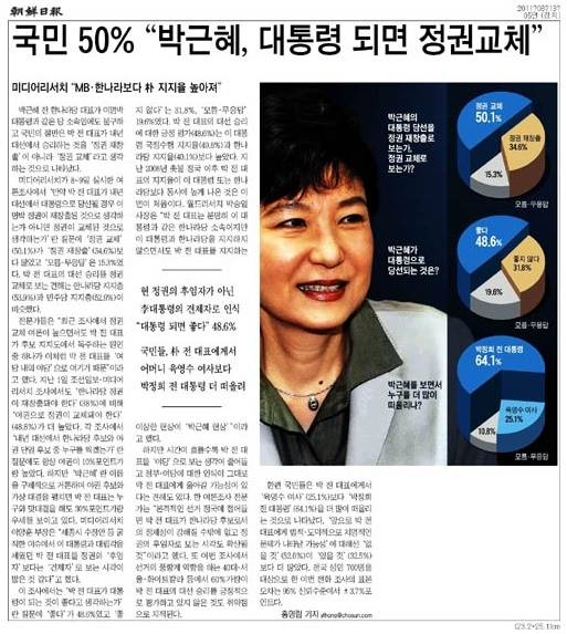 "국민 50% '박근혜, 대통령 되면 정권교체'"라는 제목의 조선일보 기사는 2011년 6월 13일, 2012년 대선 18개월 전에 등장했었다. <조선일보> 기사에서도 나오듯이, 당시 정권재창출보다는 정권교체론이 우세했다.